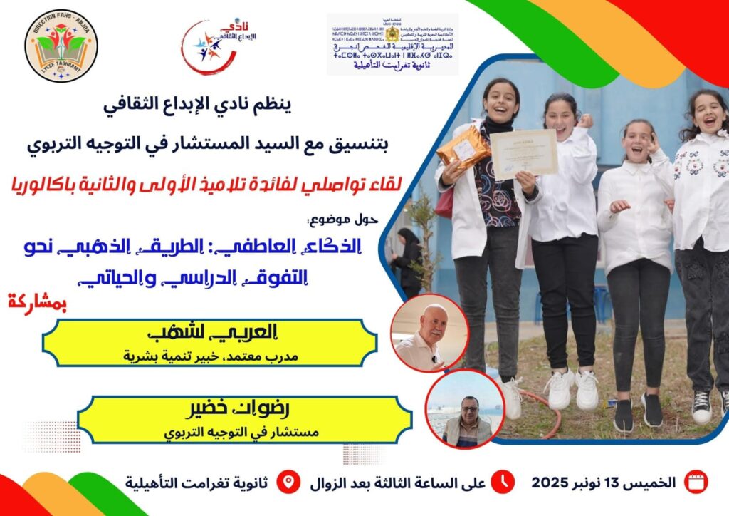 في إطار تعزيز ثقافة التميز وتطوير المهارات الحياتية لدى المتعلمين، يستعد نادي الإبداع الثقافي بثانوية تغرامت التأهيلية لتنظيم لقاء تواصلي لفائدة تلميذات وتلاميذ الجذع المشترك والسنة الثانية بكالوريا، وذلك يوم الخميس 13 نونبر 2025، على الساعة الثالثة بعد الزوال، تحت شعار:«الذكاء العاطفي: الطريق الذهبي نحو التفوق الدراسي والحياتي».