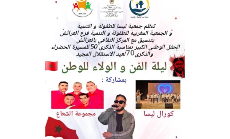 تنظم جمعية ليسا للطفولة والتنمية بشراكة مع الجمعية المغربية للطفولة والتنمية – فرع العرائش، وبتنسيق مع المركز الثقافي بالعرائش، حفلاً فنياً وطنياً تحت شعار:ليلة الفن والولاء للوطن