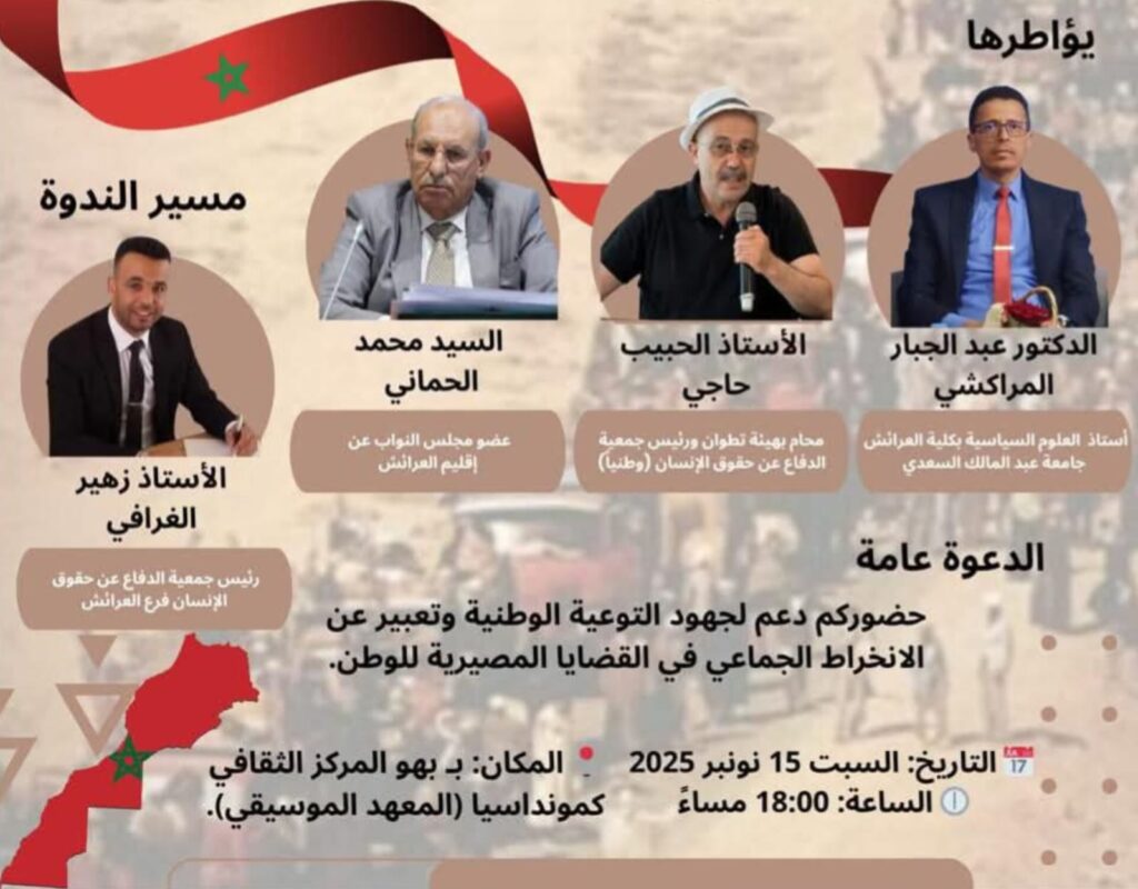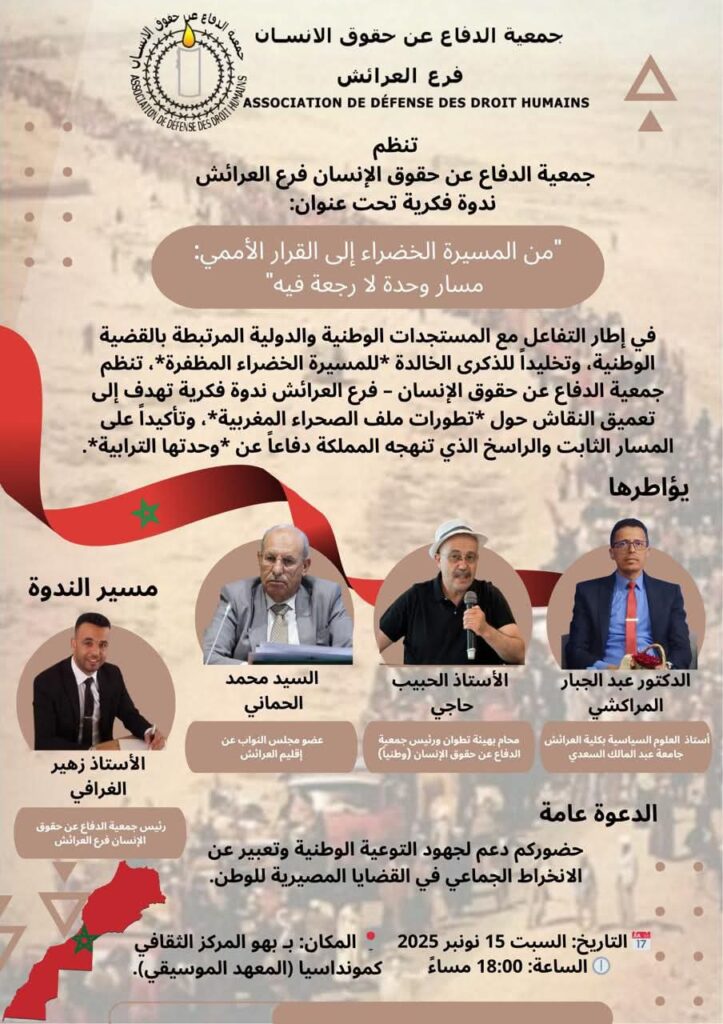في إطار تخليد ذكرى المسيرة الخضراء المظفرة، وتنزيلاً لرسالتها الوطنية المتجددة، تعلن جمعية الدفاع عن حقوق الإنسان – فرع العرائش عن تنظيم ندوة فكرية تحت عنوان:”من المسيرة الخضراء إلى القرار الأممي: مسار وحدة لا رجعة فيه”،وذلك يوم السبت 15 نونبر 2025، ابتداءً من الساعة السادسة مساءً، ببهو المركز الثقافي كمونداسيا (المعهد الموسيقي) بمدينة العرائش .