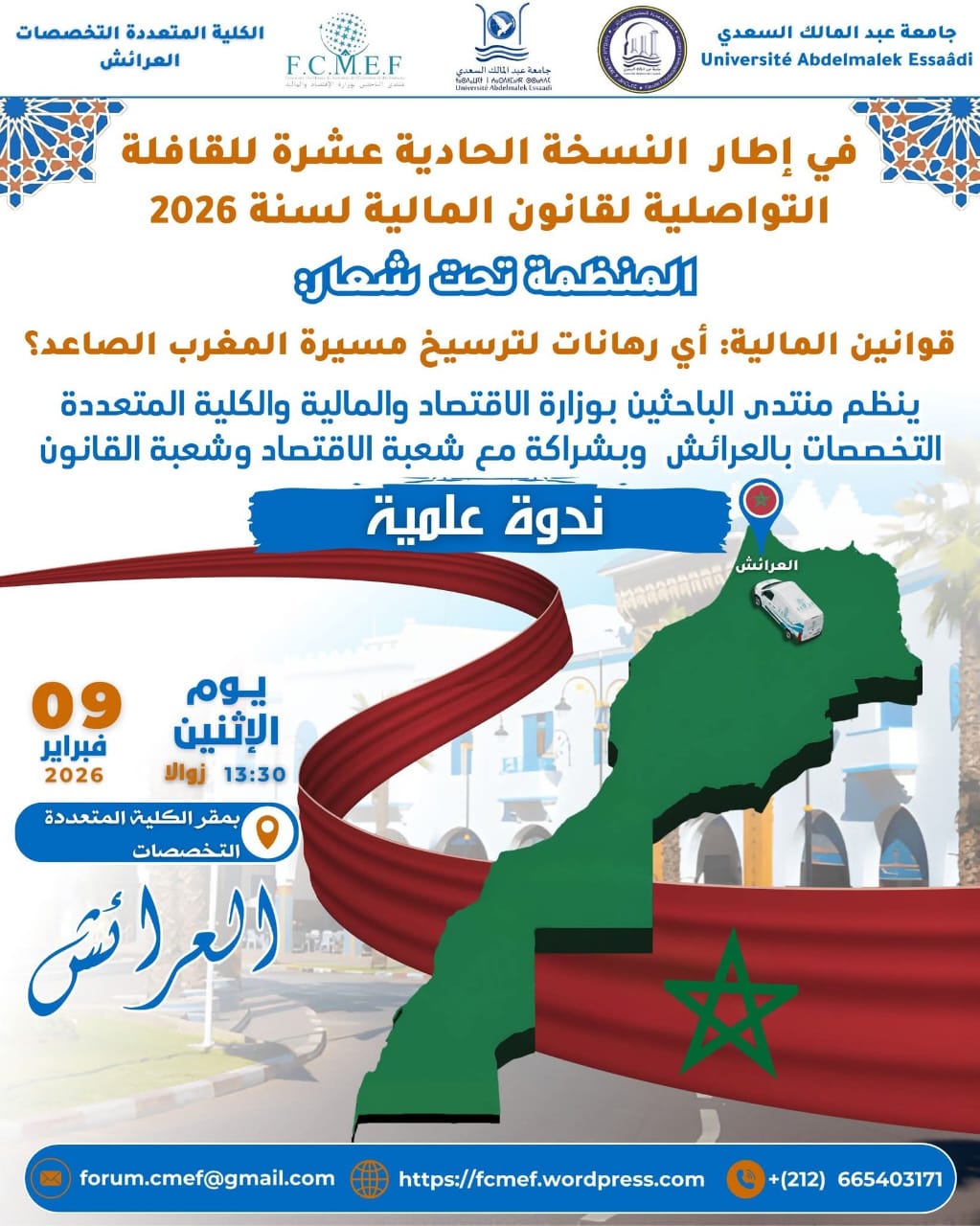 في إطار النسخة الحادية عشرة من القافلة التواصلية لقانون المالية لسنة 2026، تحتضن الكلية المتعددة التخصصات بالعرائش، يوم الاثنين 9 فبراير 2026 ابتداءً من الساعة 13:30 زوالاً، ندوة علمية حول مستجدات ومحاور قانون المالية لسنة 2026، وذلك تحت شعار: القوانين المالية : أي رهانات لترسيخ مسيرة المغرب الصاعد؟.