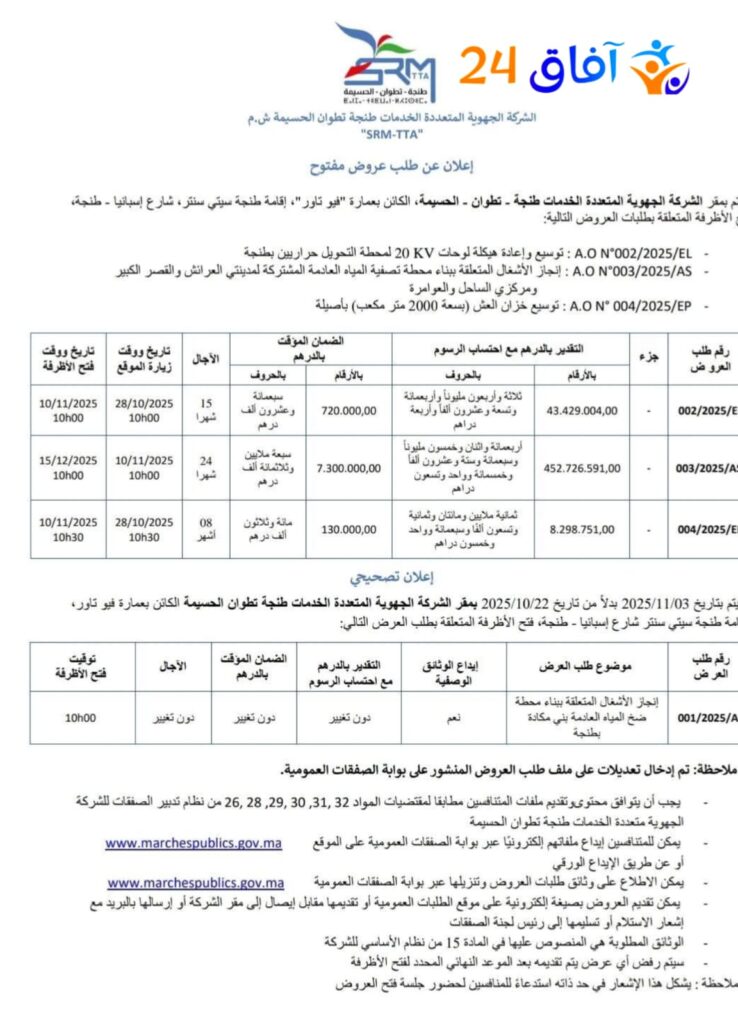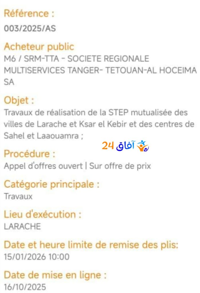 أعلنت الشركة الجهوية المتعددة الخدمات طنجة–تطوان–الحسيمة عن إطلاق صفقة عمومية لإنجاز محطة معالجة المياه العادمة بمدينة العرائش ، بكلفة تقديرية تتجاوز 45 مليار سنتيم ، و بمدة إنجاز تمتد إلى 24 شهراً. وسيتم فتح الأظرفة المتعلقة بهذه الصفقة يوم 15 دجنبر 2025 وفق المعطيات المنشورة على بوابة الصفقات العمومية.