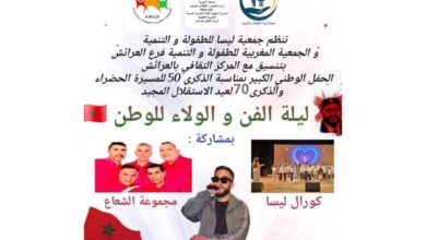 جمعية ليسا تنظم حفلاً فنياً وطنياً بالعرائش احتفالاً بذكرى المسيرة الخضراء وعيد الاستقلال تنظم جمعية ليسا للطفولة والتنمية بشراكة مع…